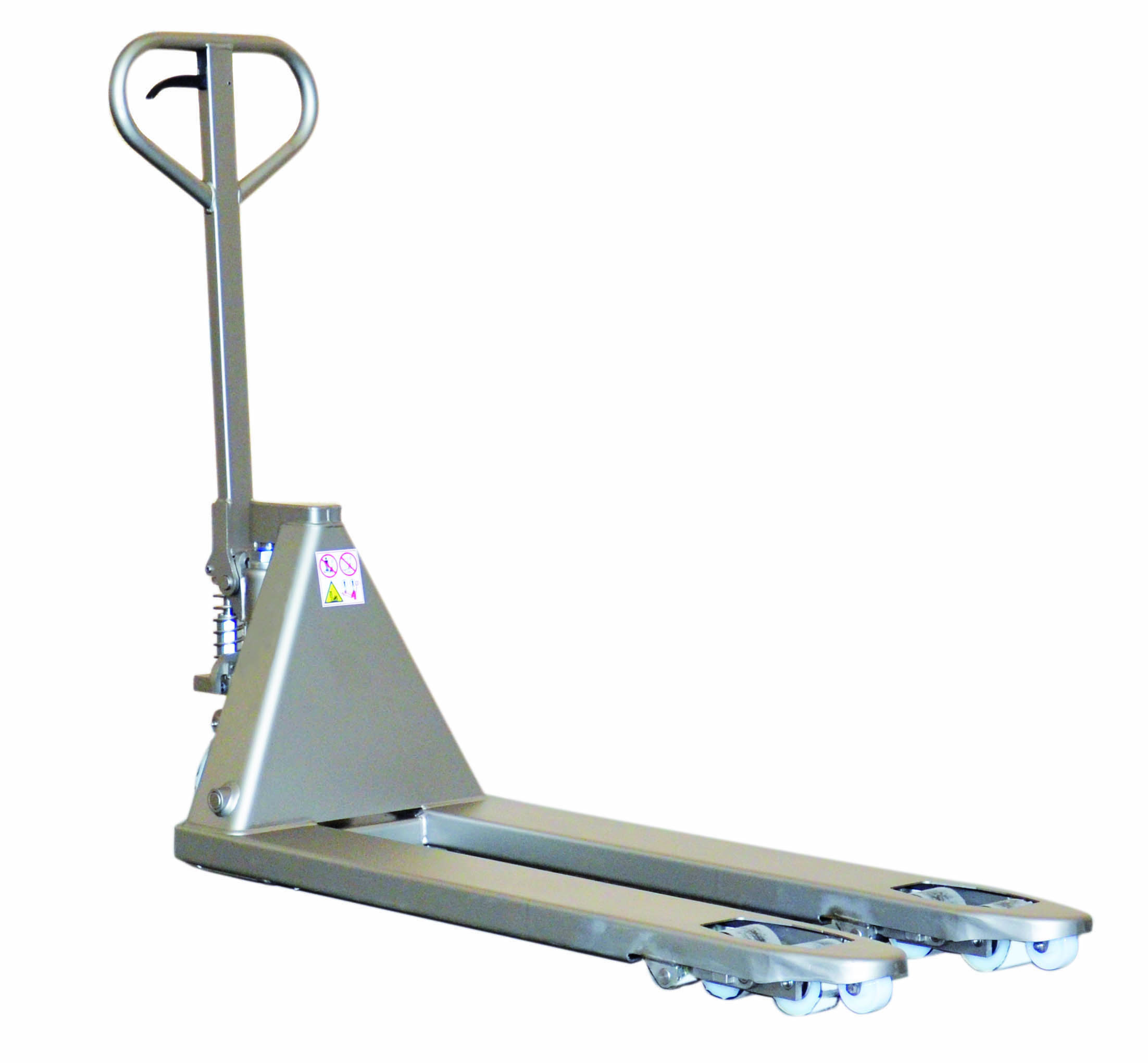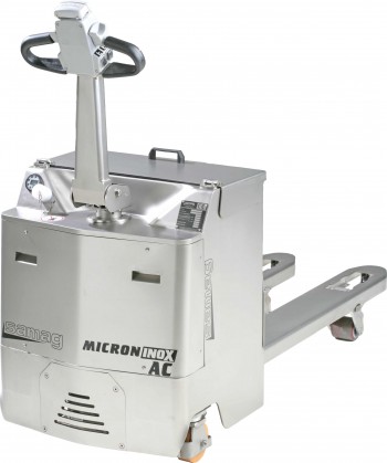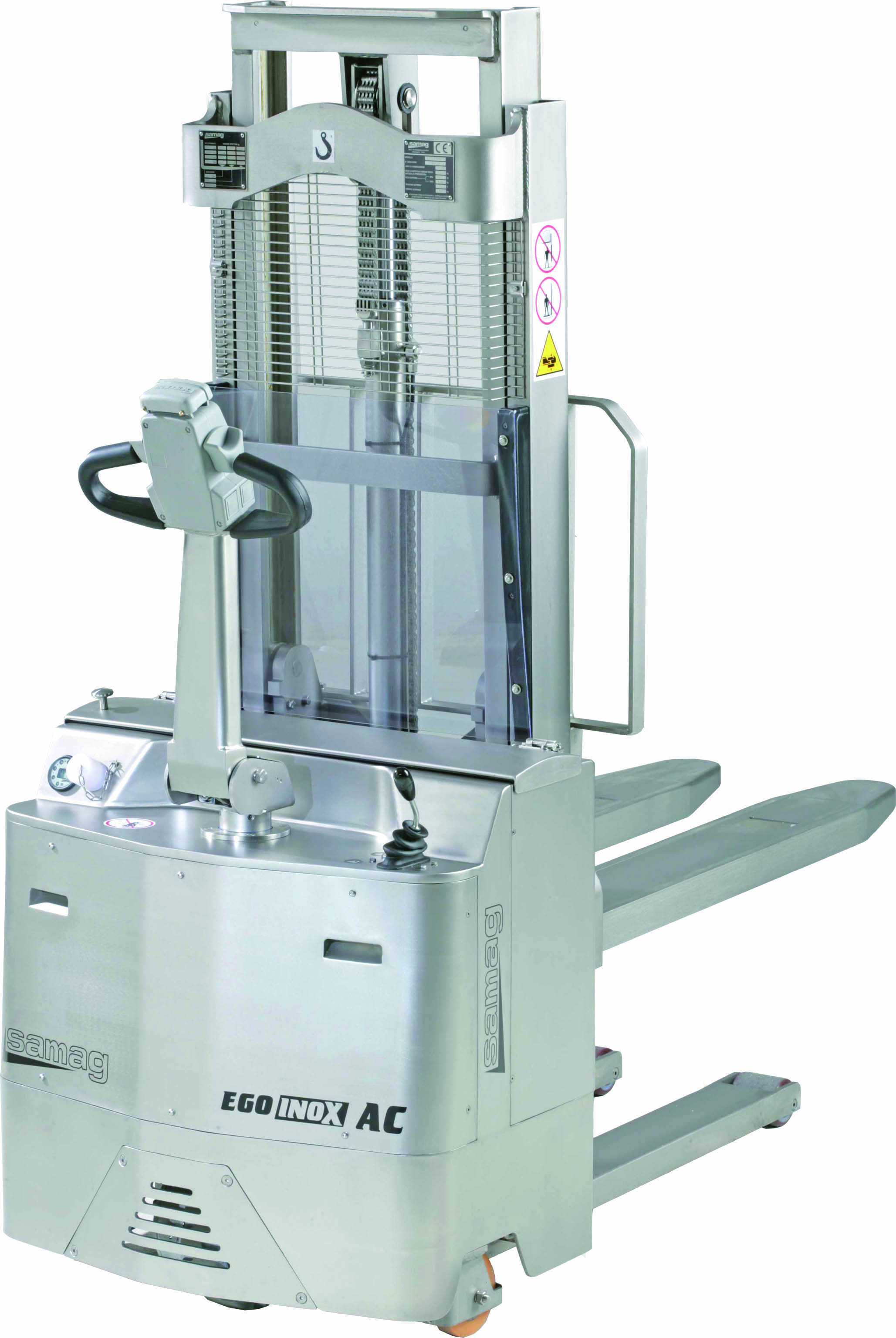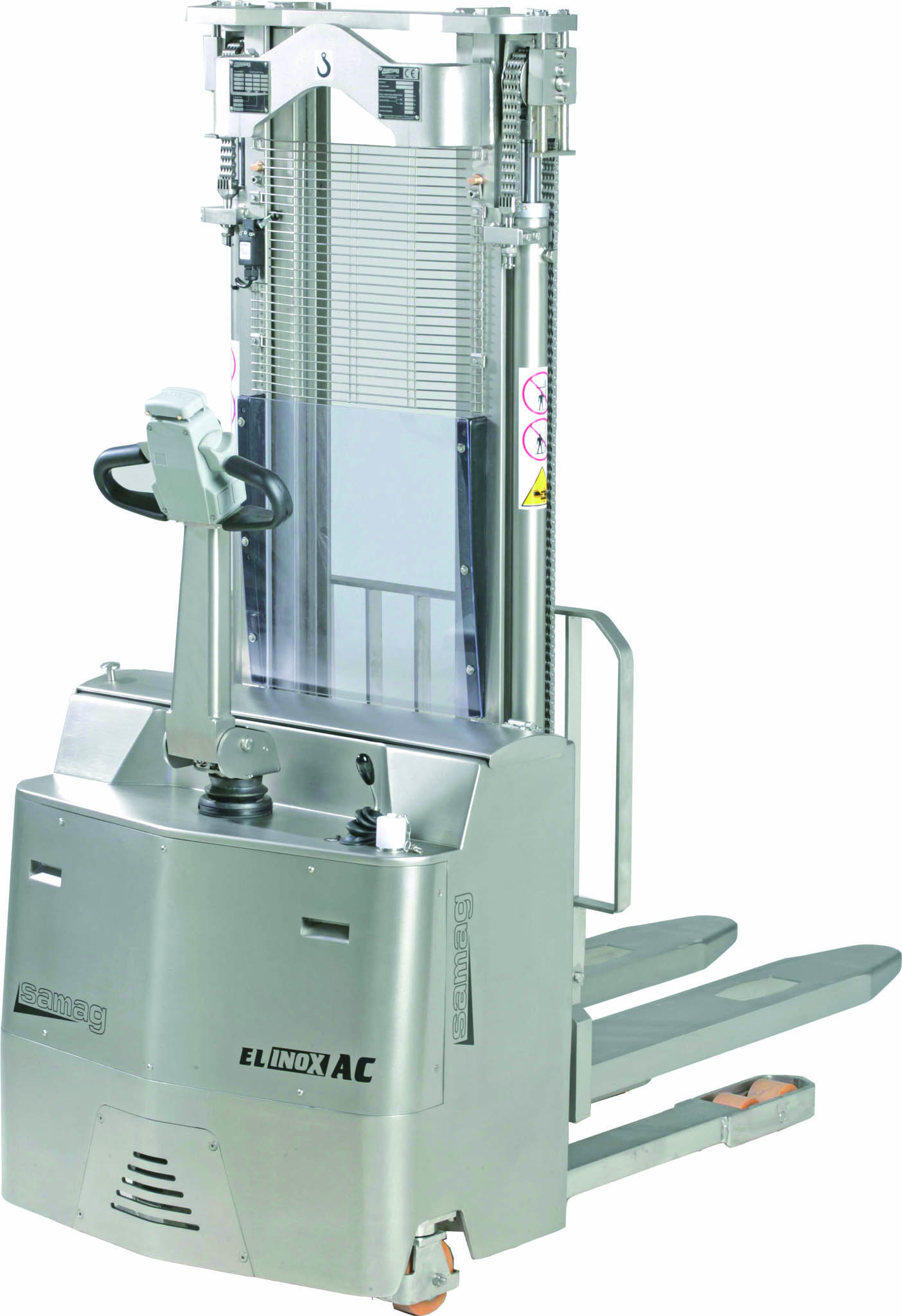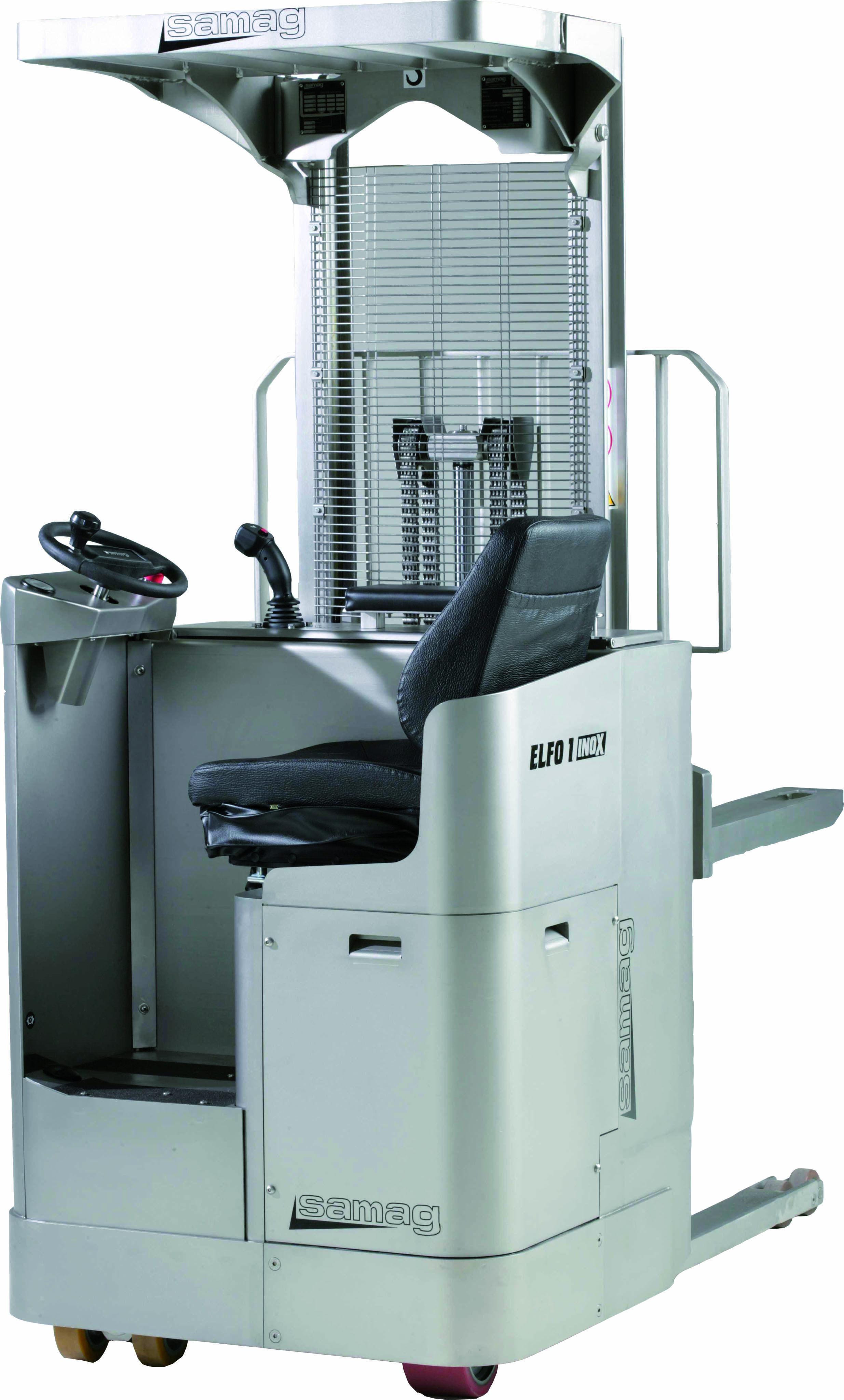 Carretilla elevadora con operador sentado en acero inox para trabajar en pasillos compactos y manipular palets hasta 4800 mm.